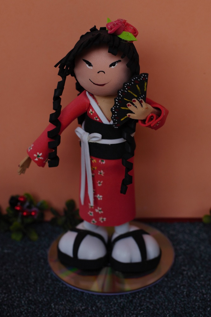 AsiatiquePoupée fofucha réalisée à la main en thermoformant des plaques de gomme EVA.Disponible sur commandeDate : 2015Technique : Poupée FofuchaTaille : Entre 10 et 20 cm
