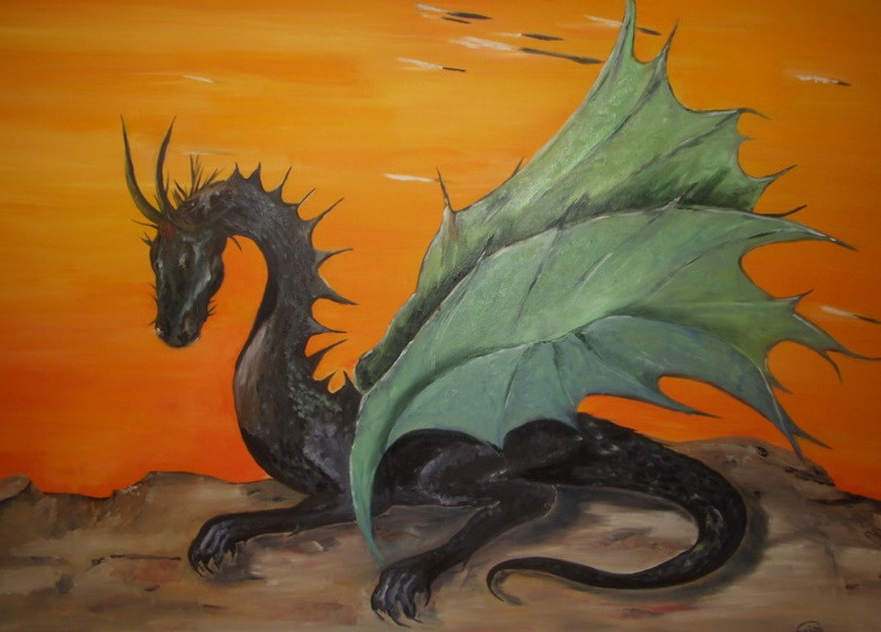 Le Dragon JauneReprésente un dragon imaginaire sur fond de ciel flamboyant.Date : Avril 2010Technique : Huile sur ToileSupport : ToileTaille : 100 x 80 cmEncadrement : Non encadrée
