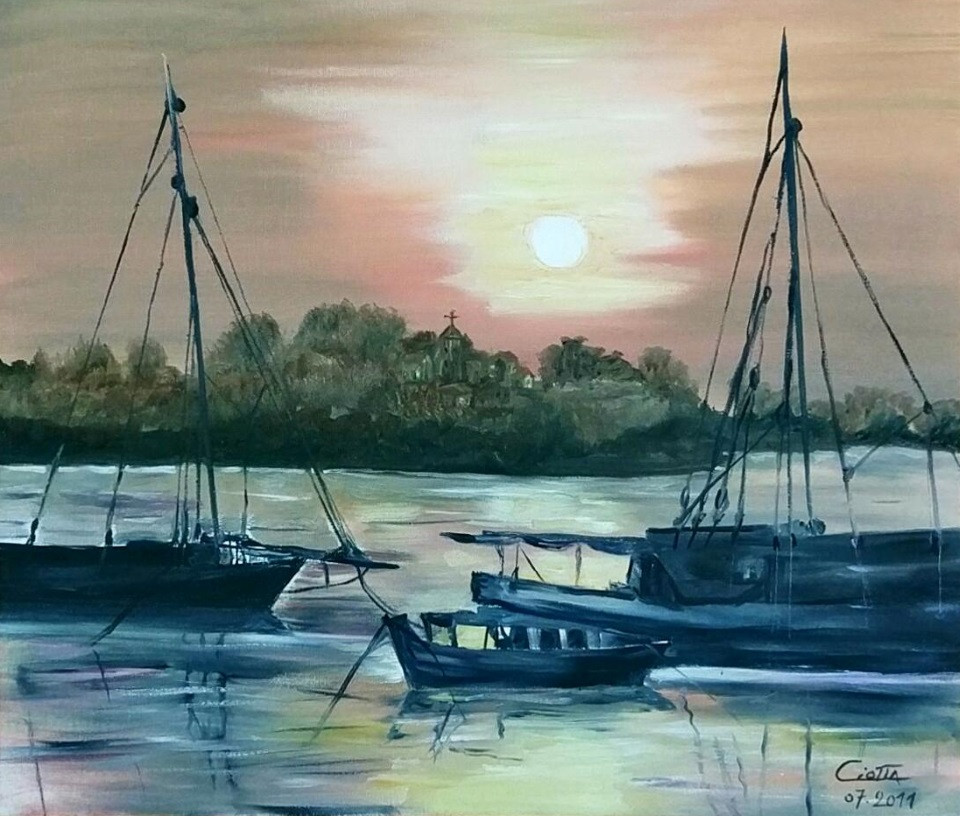 NocturneUn coucher de soleil sur une mer d'huile.Date : Juillet 2011Technique : Huile sur ToileSupport : ToileTaille : 55 x 46 cmEncadrement : Encadrement bois, liseré or de 70 x 60 cm