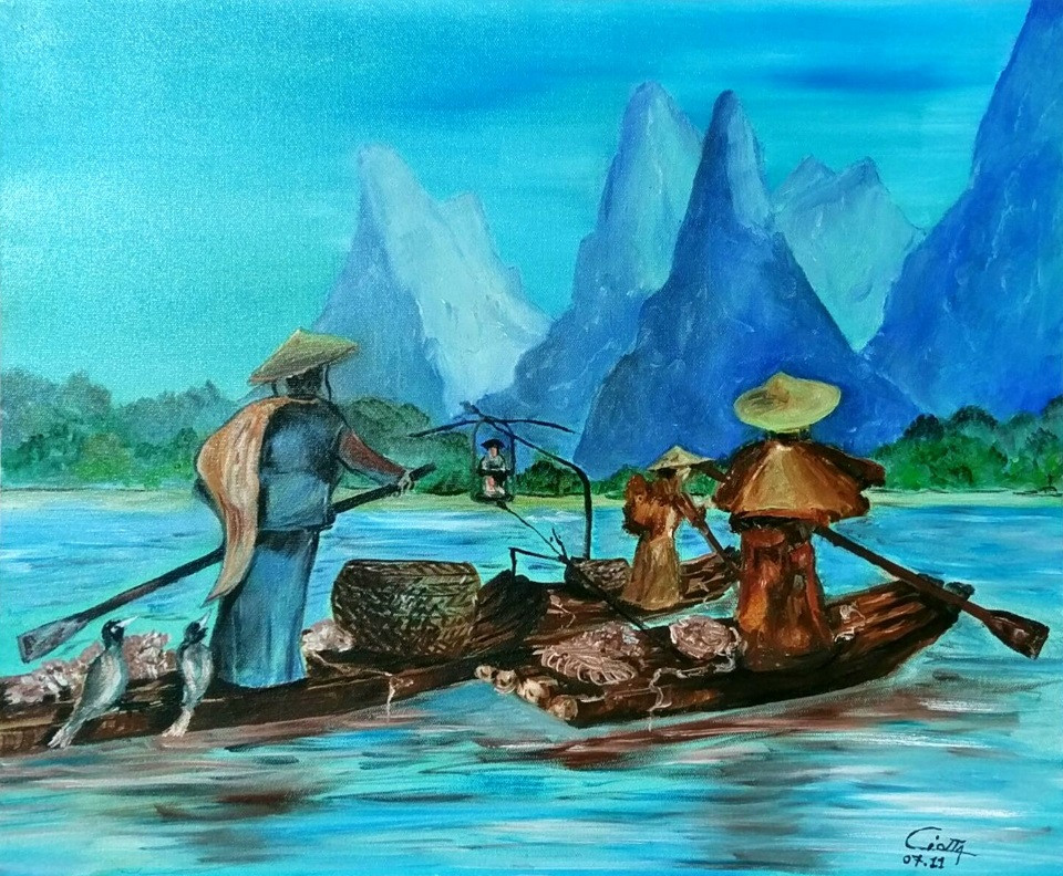 Pèche d'OrientVendeurs d'Orient sur leurs embarcations.Date : Juillet 2011Technique : Huile sur ToileSupport : ToileTaille : 55 x 46 cmEncadrement : Non encadrée
