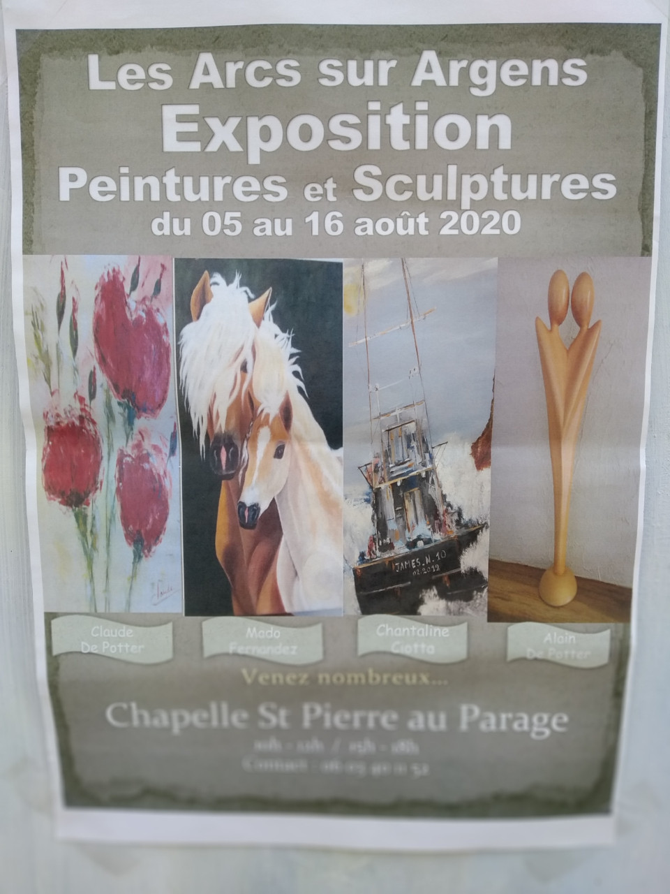 Mercredi 5 Août - Dimanche 16 Août 2020 Horaires : 10h - 12h / 15h - 18hAdresse : Chapelle Saint Pierre au ParageVille : Les Arcs sur ArgensTéléphone : 0603401152