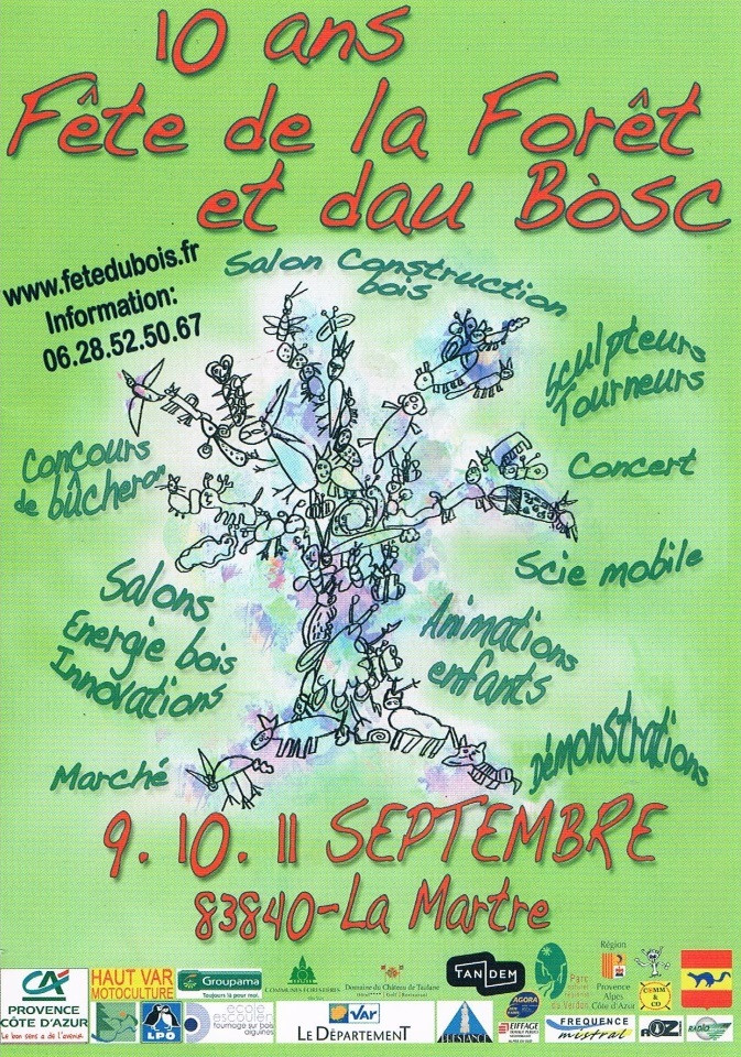 10 ans de la Fête de la Forêt et du Bois. Concours de bûcherons, salons énergie / bois / innovation, marché, sculpteurs / tourneurs, concert, scie mobile, animations enfants, démonstations.