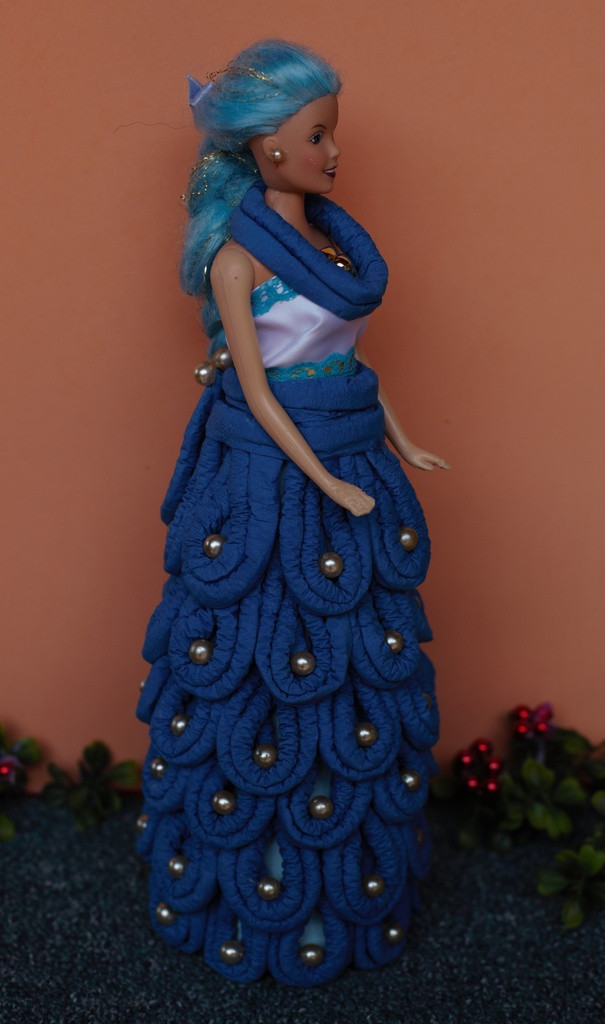 Barbie bleuPoupée Barbie avec robe de soirée faite en papier et perles.Disponible sur commande.Date : 2015Technique : Poupée FofuchaTaille : Entre 10 et 20 cm