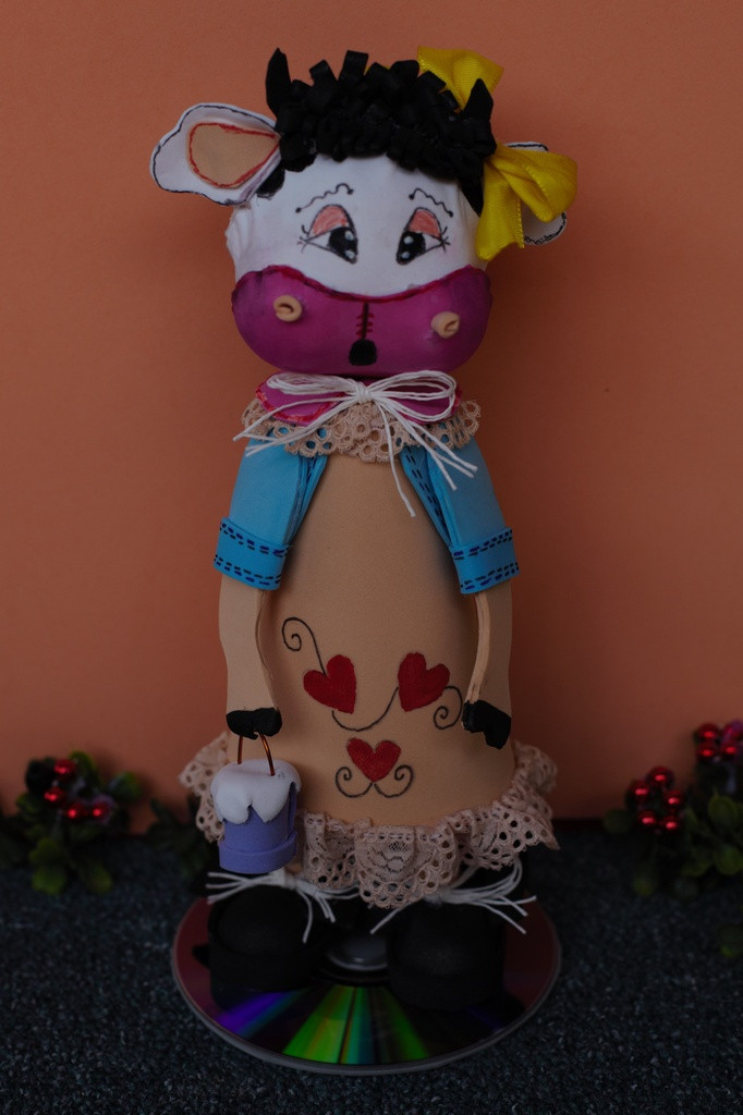 La vachePoupée fofucha réalisée à la main en thermoformant des plaques de gomme EVA.Disponible sur commandeDate : 2015Technique : Poupée FofuchaTaille : Entre 10 et 20 cm