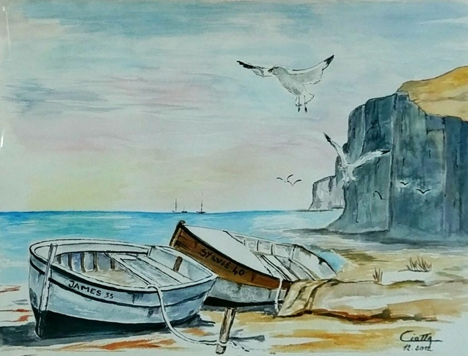 Sur le sableDes bateaux sur le sable proche d'une falaise monumentale.Date : Décembre 2012Technique : AquarelleSupport : Papier AquarelleTaille : 47 x 36 cmEncadrement : Vitré