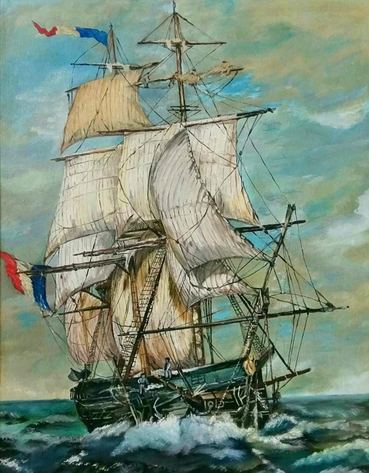 Le galionUn galion sous pavillon français.Date : Juillet 1999Technique : Huile sur ContreplaquéSupport : ContreplaquéTaille : 80 x 60 cmEncadrement : Bois couleur or