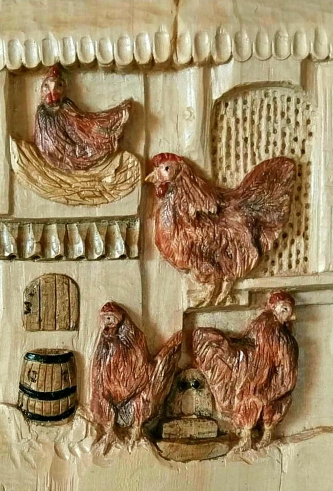 Le poulaillerDate : Février 2016Technique : Bas-reliefSupport : Bois tilleulTaille : 34 x 25 x 3,5 cm
